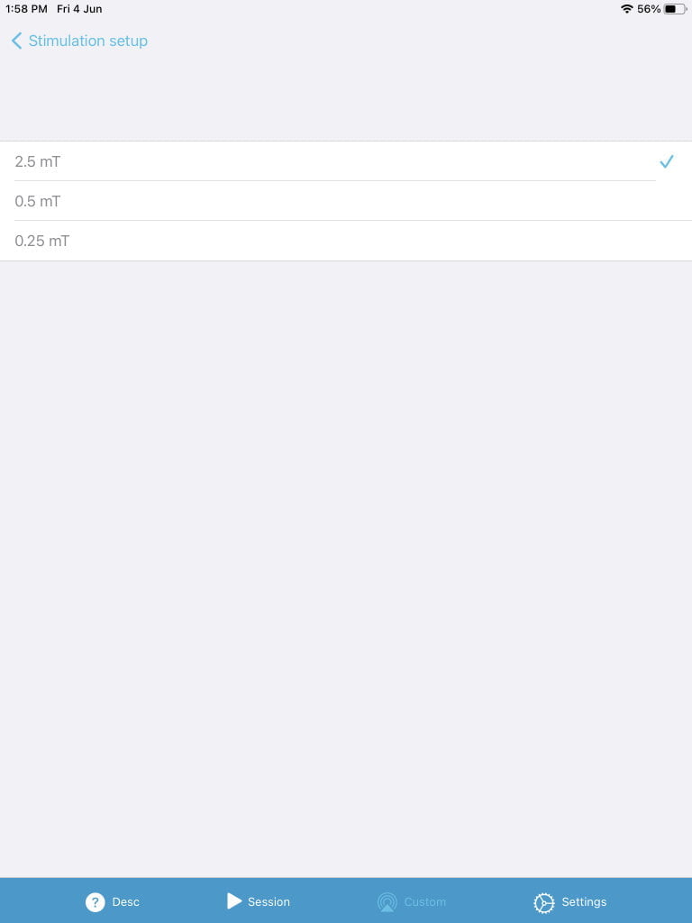 Custom programs offers 3 level of intensities – 0.25, 0.5 and 2.5mT, activation of side, front or all coils, and a custom single frequency from of 1,2,3,4,5,6,7,7.83,8,9,10.1,11.3,12.1, 13.5, 14.3,16,18,20.25,24,27.3,33.8,40,48 and 50.57Hz.